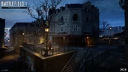 Delaunay Trench is found on the north side. Both the intact buildings and the trench dugout behind them provide decent cover in the capture zone. The second storey of these buildings can be used to survey the street-level approaches and lower ground capture area, however the capture zone only allows the flag to be influenced from the first floor. Defenders spawning on the flag can be placed at the end of the blocked-off street to the north, meaning a counterattack can come that direction.