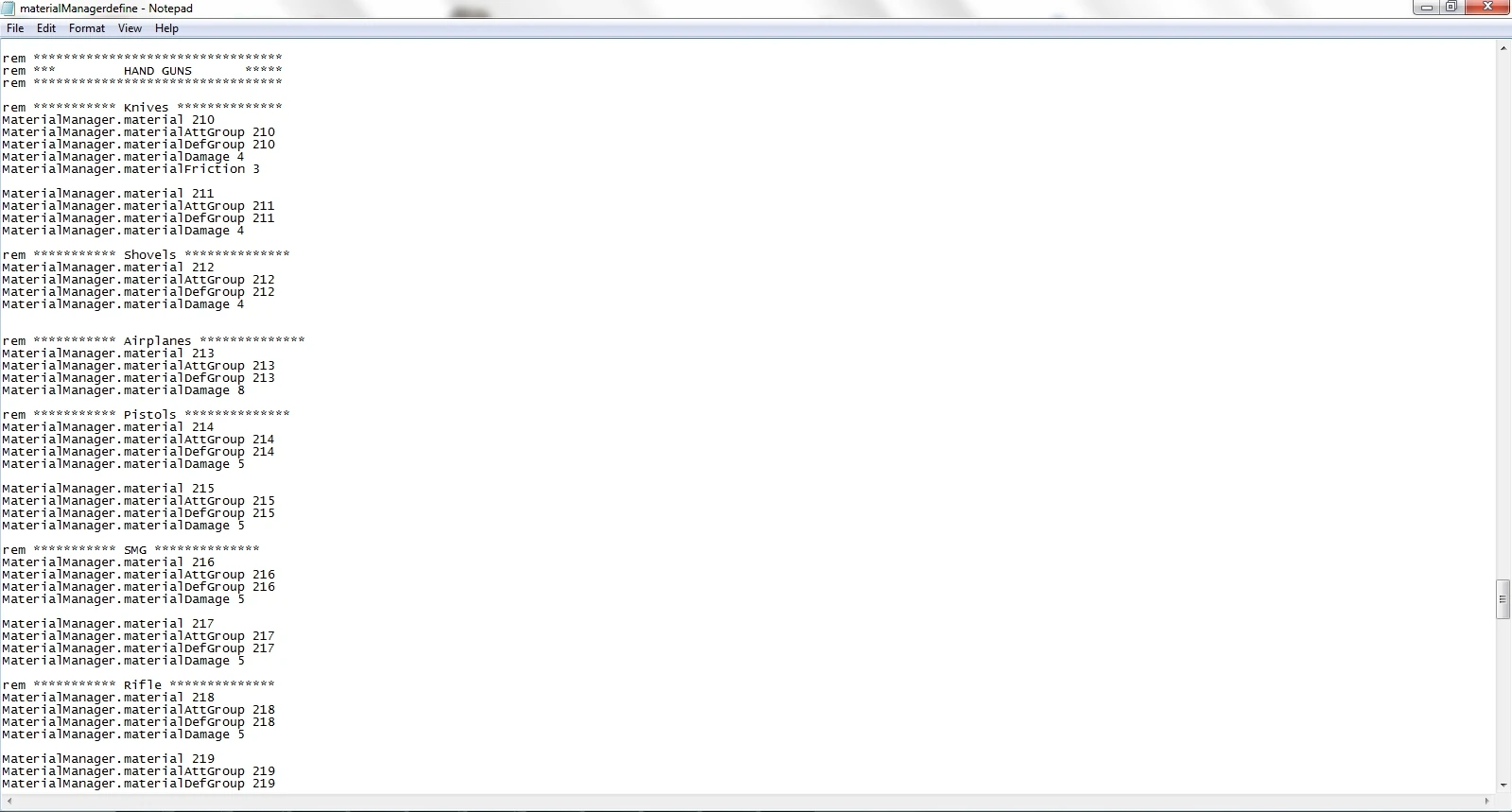 One issue with Battlefield Vietnam is the unaltered usage of Battlefield 1942 damage system files. This means that many of the weapons used in Battlefield Vietnam are either simply renamed Battlefield 1942 files or non-renamed files determining the modified damage. However, if one were to look in each damage system file, the material line is usually unique, so, for example, only one has material 218. In this case, it is under the file "sniper".