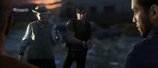 - When driving from the Last Chance diner to the compound, Nick passes a film billboard for a (fictitious) western film named The Devil You Know directed by Isaac Clarke, the protagonist of Visceral's Dead Space series.