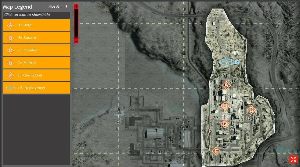 The US deployment is not much more than a few houses on either side of a long road leading into the city. There is only a small line of trees blocking the lines of sight for teams to avoid combat. The deployment only contains two armored vehicles to strike the enemies guarding the city. US soldiers must act fast to avoid being pinned down at the road leading to the hotel as most to all of the RU soldiers set up an ambush at the Hotel. A good tactic to use when pinned down is to move along the rocks on the east side of the road and flank enemy flags to create an opening for allies to attack the defending Russians.