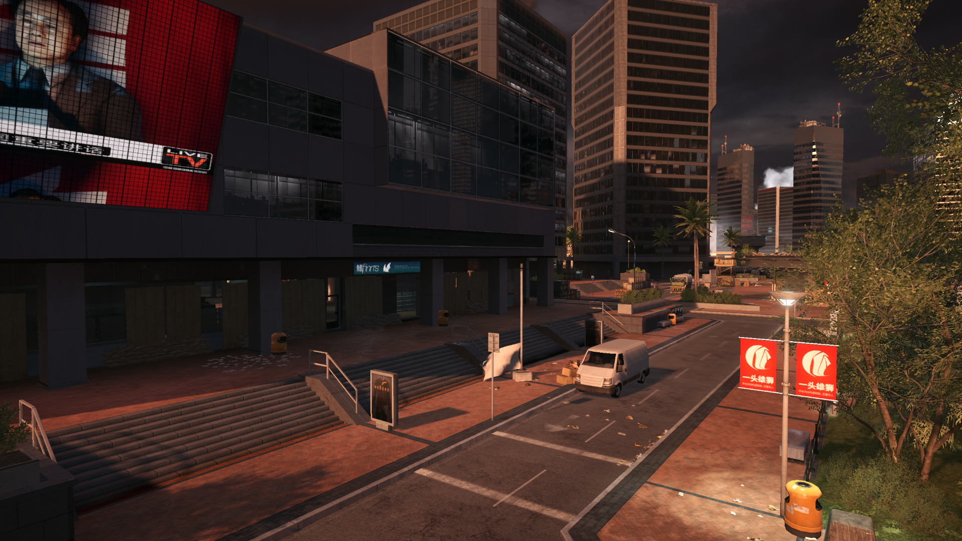 Flag E, located directly north of the Chinese deployment, consists of a fortified square of concrete pillars and guard towers, with the flag itself sitting in the middle of the plaza near an illuminated statue centerpiece. The capture zone on this flag is quite small, meaning players will have to stay very close to the central area to gain the objective. Mostly exposed to fire from the top floor of D flag, the area surrounding the plaza is quite generously covered; the street to the north is lined with stationary cars and buses, while a large commercial building across the road to the east can be occupied for overhead cover. An M32 MGL spawns on the other side of said building, near the waterfront.