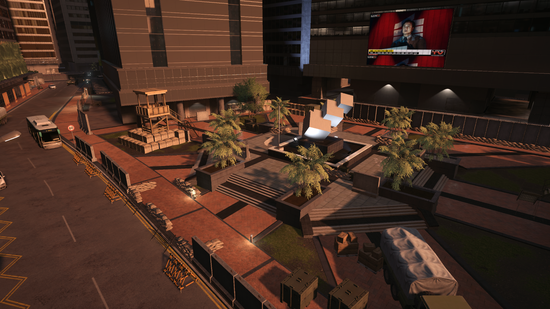 Flag F is on the north side of the plaza found at Flag E on Conquest Large. Here, a row of heavy fortifications and parked buses block light of sight to the flag proper, with the only significantly vulnerable area being the street in between the plaza and the parking garage.