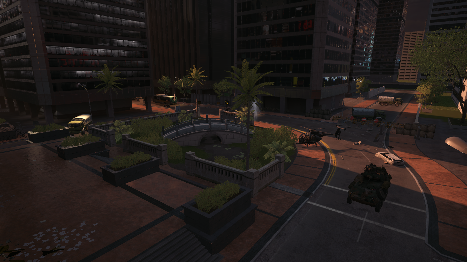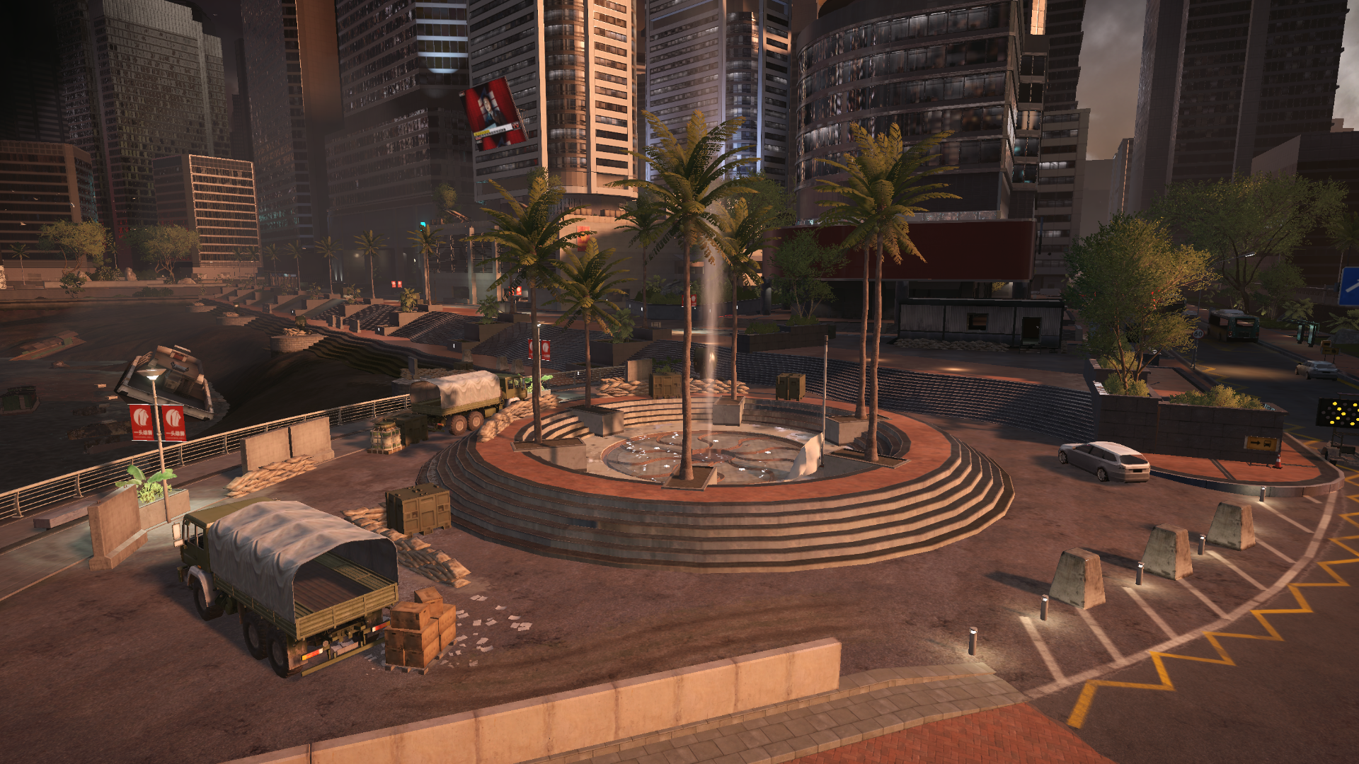 The initial engagement takes place in the plaza on the far west side of the map (flag E on Conquest Large), with the attacking team being airdropped in up the road to the north. The tight map boundaries in this area restrict any major broad flanking maneuvers, however when spawning in the USMC can land on top of a high-rise building that overlooks the plaza, allowing for an elevated firing position.