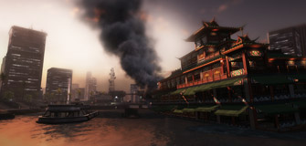 The map takes place in a Hong Kong business area around the Sea Dragon, a floating restaurant that has been sunk by missiles. Similar to Siege of Shanghai, Sunken Dragon's urban environment is home to limited combined arms warfare, with teams having access to an IFV and Scout helicopter each, as well as a number of light Transport Vehicles. The riverbed that separates the map, as well as the abundance of elevated vantage points offered by some flags, usually results in some long ranged engagements, while the street level objectives cater heavily to infantry combat. The map also features many high-rise buildings that are accessible by helicopter, leading to many flags being attacked by players parachuting down from the rooftops.