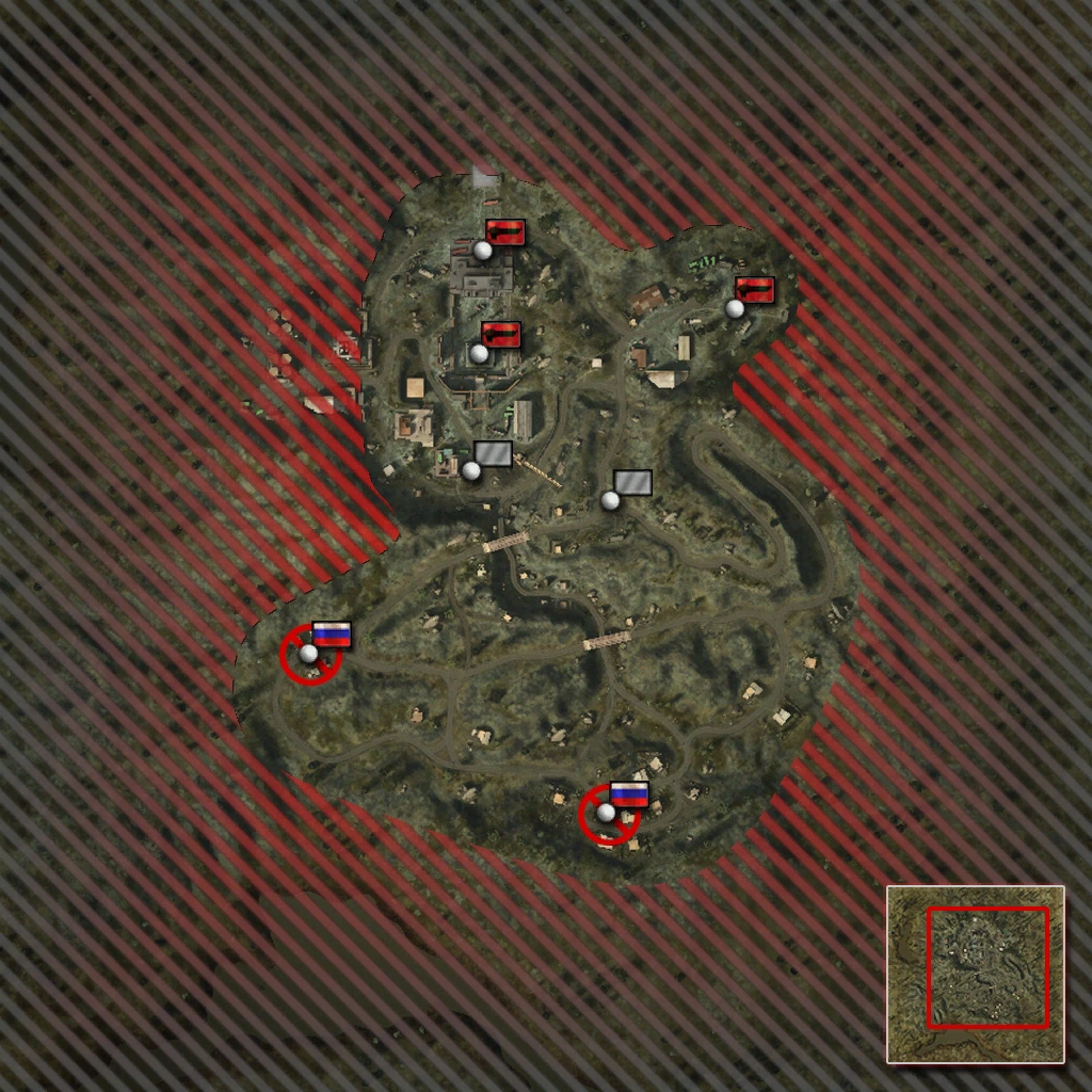 In the 32-player version, the Spetsnaz start from uncapturable bases to the south of the 16-player version. The loading screen shows the map preview mistakenly: the boundaries of the map extend to an area to the west of the Launch Pad (see the 64-player version below)