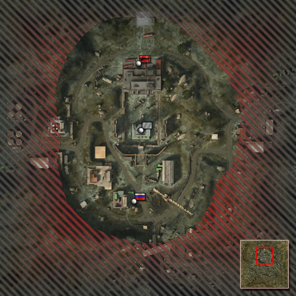 The Rebel main base in the far north. It spawns two artillery pieces, the UAV trailer and radar station, as well as a stationary RPK-74 LMG, an IGLA and a T-90 for both factions, in addition to a Pickup Truck and Mi-35 HIND for the Rebels only. If it is captured by the Spetsnaz, it will only spawn a FAV along with aforementioned vehicles.